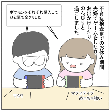 実際、不育症検査までのお休み期間は、夫婦でポケモンを色違いで買い、毎晩少しずつ進めたのですが「どこまで行った?」「どんなポケモンを捕まえた?」「この敵強いよ!」など二人で夢中になってしまいました。ポケモンは、私のボロボロになった心を癒してくれた、ありがたい存在です。